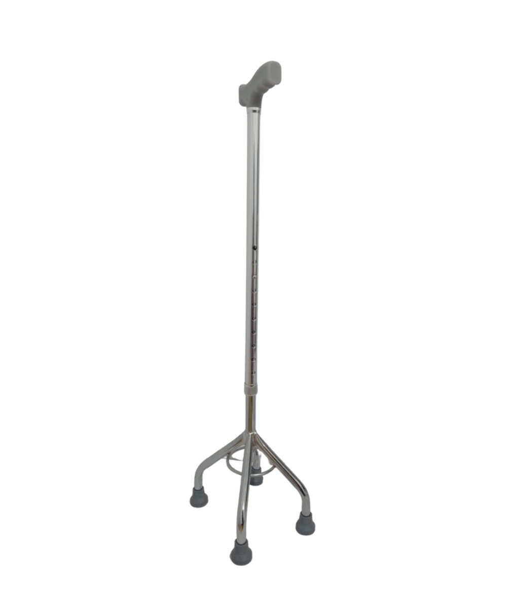 Bastón recto de aluminio regulable en altura con cuatro apoyos.