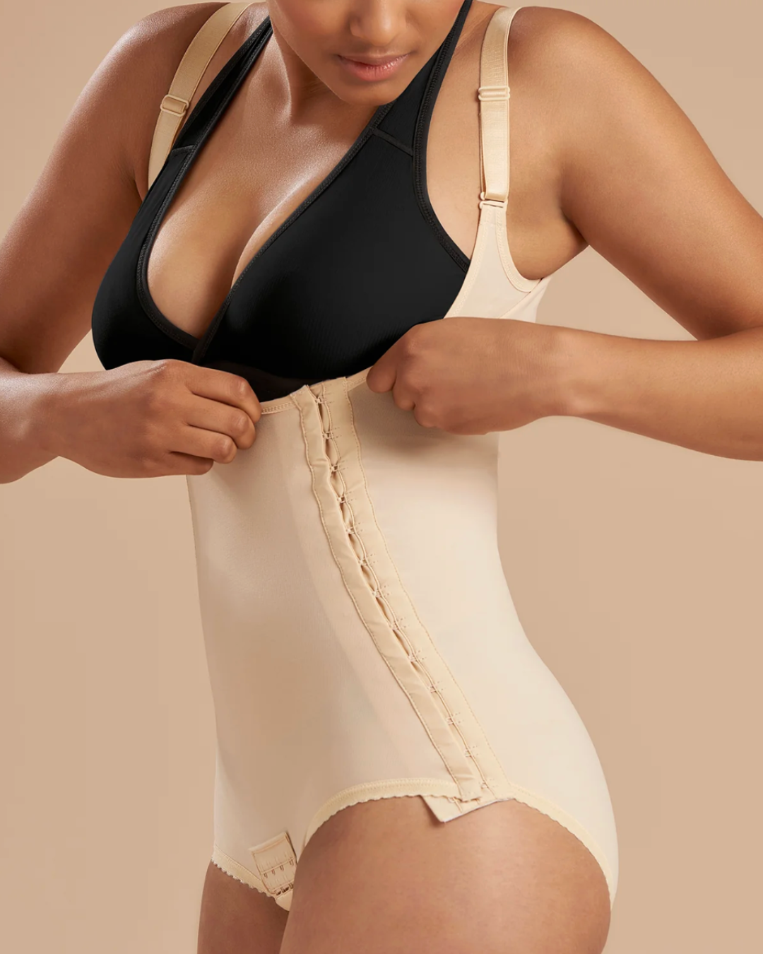 Faja postquirúrgica tipo bikini con cobertura de espalda alta, indicada para el período de recuperación luego de cirugías abdominales y procedimientos estéticos.